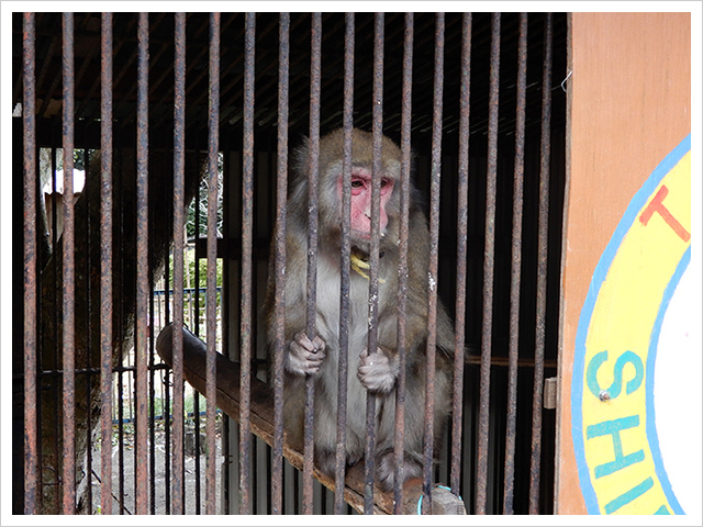 ニホンザルの「ラン」が置かれている檻は、奥行き約11.5m、幅約2m、高さ約2mの非常に小さな空間です。中にあるのは丸太が一本と、奥の角に渡してある三角の板のみで、中には人の目から隠れる場所もなく、地面も周囲の檻同様に鉄の柵です。また、檻全体は、南に大きく傾いています。