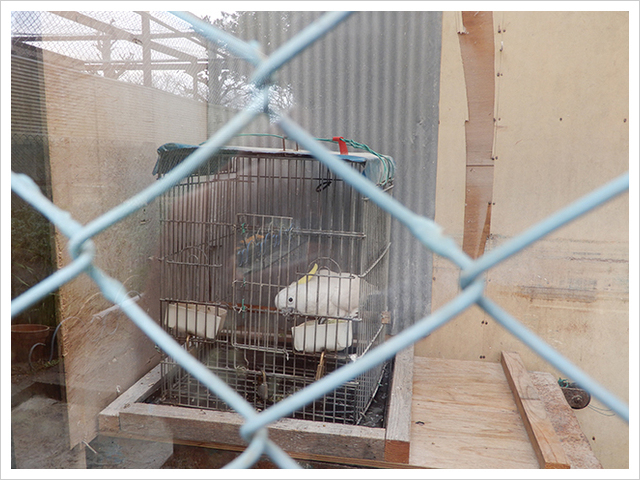 キバタンはいつも「ラン」の檻の左横の柵の中にケージごと入れられています。